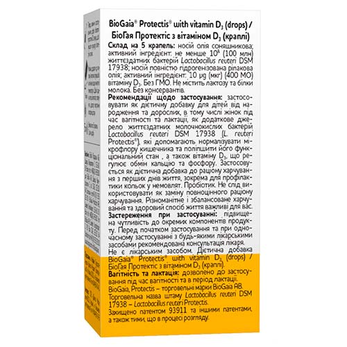 БиоГая Протектис с витамином D3. Капли содержит в своем составе естественную форму витамина D, которая в норме синтезируется в организме человека, активно участвует в работе желудочно-кишечного тракта, регулируя его моторику, также играет важную роль в абсорбции кальция, фосфатов и магния в кишечнике, транспорте минеральных солей. Витамин D необходим для функционирования паращитовидных желез, почек и костной системы.
