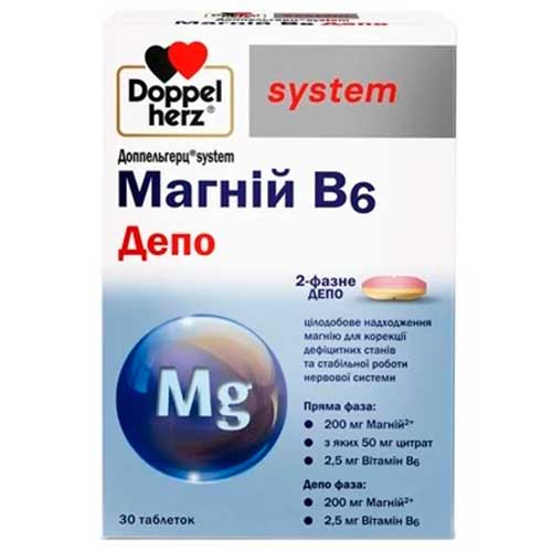 Доппельгерц System Магний В6 депо в таблетках обеспечивает организм магнием – важным минералом, который не вырабатывается в организме, а поступает экзогенным путем. Магний сохраняется в организме в ограниченном количестве, а его потребность может увеличиваться в зависимости от нагрузок организма. Достаточное количество магния поддерживает энергетический обмен, сбалансирует работу нервной системы, способствует нормальной работе мышц.