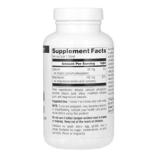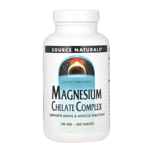 Source Naturals Magnesium Chelate Complex — это высококачественная добавка с легкоусвояемой формой магния в виде хелатного комплекса, содержащая 100 мг элементарного магния в каждой таблетке. Магний в этом продукте связан с аминокислотами (обычно глицином), образуя хелатный комплекс. Это делает минерал «защищенным» и позволяет ему легко проходить через пищеварительную систему, обеспечивая максимальное усвоение без конкуренции с другими минералами.