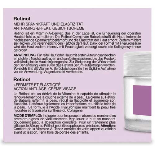 Крем проти зморшок з ретинолом надає шкірі пружність, зменшуючи в'ялість та підвищуючи її еластичність. Зменшує дефекти та вирівнює тон шкіри. Його формула з гіалуроновою кислотою зберігає шкіру зволоженою і сприяє синтезу колагену. Ретинол – похідний вітаміну А допомагає прискорити регенерацію зовнішнього шару шкіри.