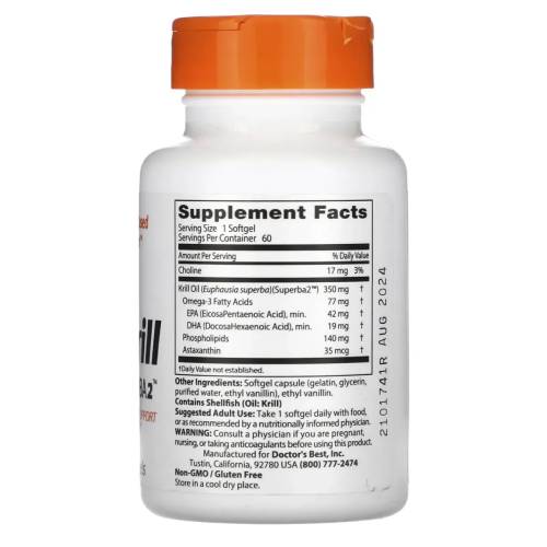 Real Krill with SuperBA Krill Doctor's Best – дієтична добавка, що містить унікальний склад жирних кислот, фосфоліпіди та нейтралізатор вільних радикалів астаксантин, важливий для підтримки імунної системи.