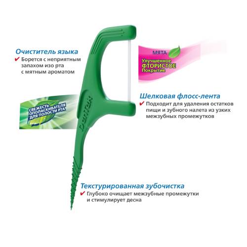 Ультра-шовковий стрічковий флос плавно ковзає між зубами, не дратуючи чутливі ясна. Текстурована зубочистка глибоко очищає міжзубні проміжки, одночасно масажуючи ясна. Скребок для язика допомагає усунути неприємний запах із рота. Стійкий м'ятний аромат, як в ополіскувача для ротової порожнини, забезпечує свіжість дихання.