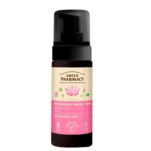 Пінка для вмивання освіжаюча поєднує молочні протеїни та екстракт лотосу, та є чудовим засобом для догляду за чутливою шкірою обличчя. Пінка м’яко впливає на шкіру, глибоко очищає її від забруднень і макіяжу, не викликає відчуття стягнутості та сухості, не порушує природний баланс шкіри.