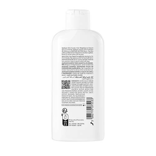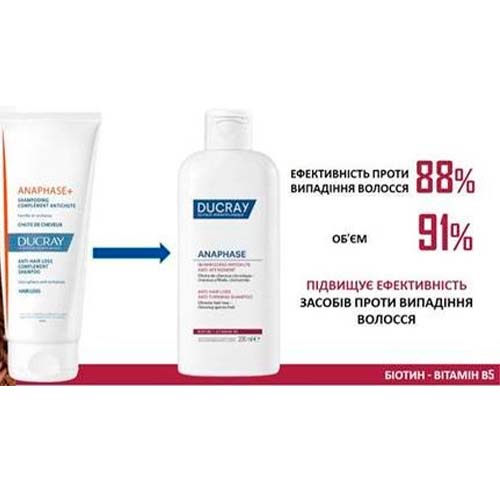 Ducray Анафаз шампунь проти випадіння та для укріплення волосся — шампунь з доведеною ефективністю проти хронічного випадіння та витончення волосся. Оптимально готує шкіру до нанесення зовнішніх засобів проти випадіння волосся, підсилює мікроциркуляцію шкіри голови, збільшує об'єм волосся, повертає йому силу і життєву енергію.