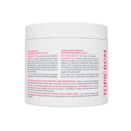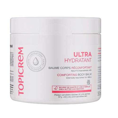 Ультразволожувальний заспокійливий бальзам для тіла Топікрем глибоко живить та зволожує суху шкіру протягом 48 годин. Засіб збагачений насиченими ліпідами (14,5%) з олій рослинного походження: солодкого мигдалю, соняшника та кокосу, а також містить олію каріте, гліцерин та очищений бджолиний віск. Дія бальзаму зменшує сухість та пом’якшує шкіру, усуває відчуття дискомфорту, захищає шкіру від впливу зовнішніх факторів (холод, вітер, жорстка вода).