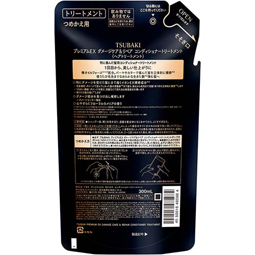 Відновлювальний кондиціонер TSUBAKI Premium EX Damage Care & Repair з олією камелії забезпечує інтенсивне реконструювання пошкодженого волосся. Формула засобу поєднує силу натуральних компонентів та новітніх технологій, які мають миттєвий відновлювальний ефект, запобігають ламкості та пошкодженню волосся в майбутньому. Після застосування кондиціонера пасма стають шовковистими та гладкими, набувають неймовірного блиску, легко розчісуються та укладаються. Триступеневий підхід (розширення → проникнення → ущільнення) підтримує баланс зволоженості та блиску волосся в максимально ідеальному стані та робить його здоровим і доглянутим, немов із салону. Подвійна амінокислота у складі кондиціонера розширює клітинну мембрану та полегшує проникнення косметичних інгредієнтів, живлячи та відновлюючи волосся.